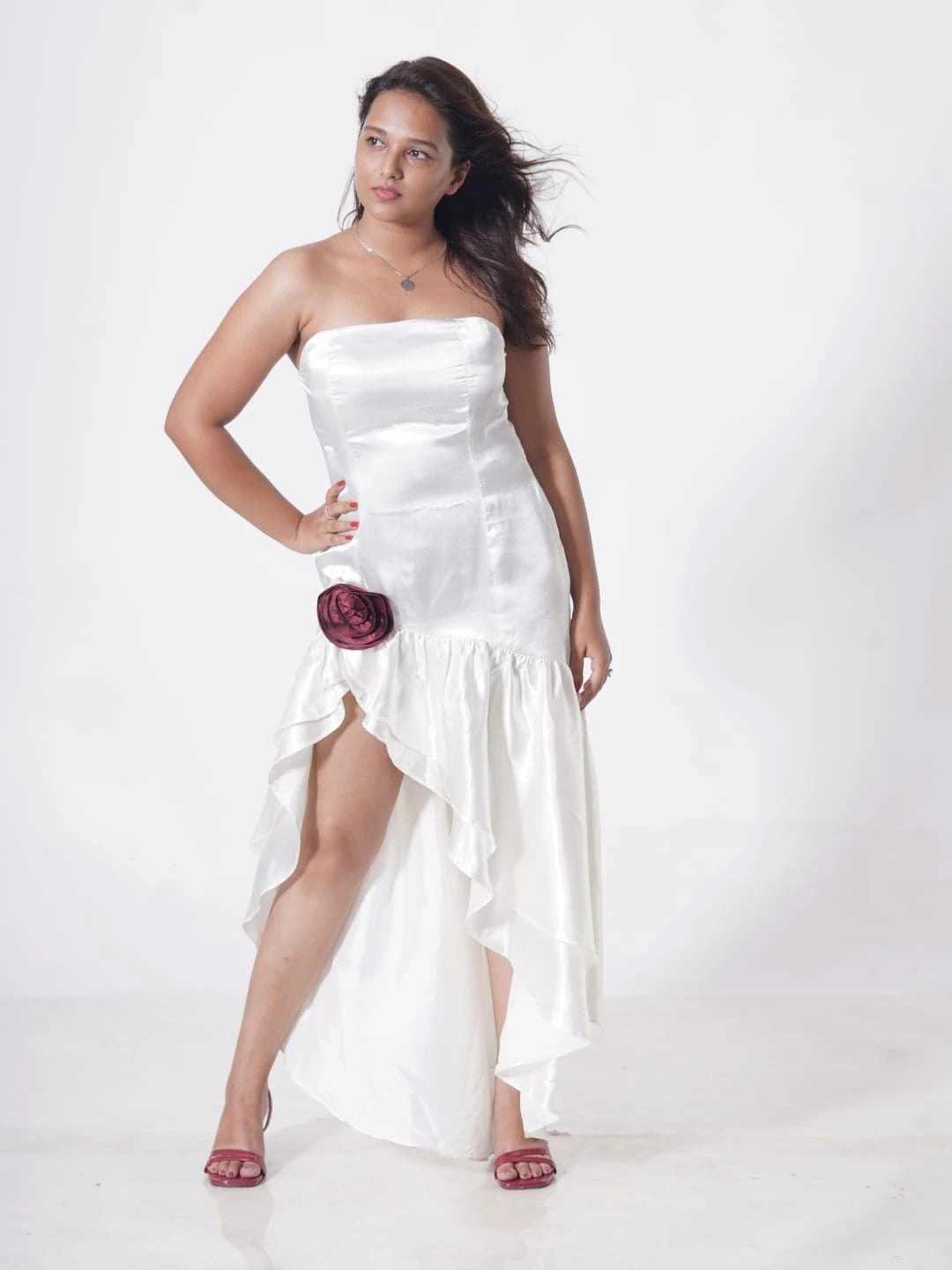 It feels like wearing liquid air—romantic, delicate, and free-spirited. The side lift gives it a daring edge, balancing softness with a quiet boldness.